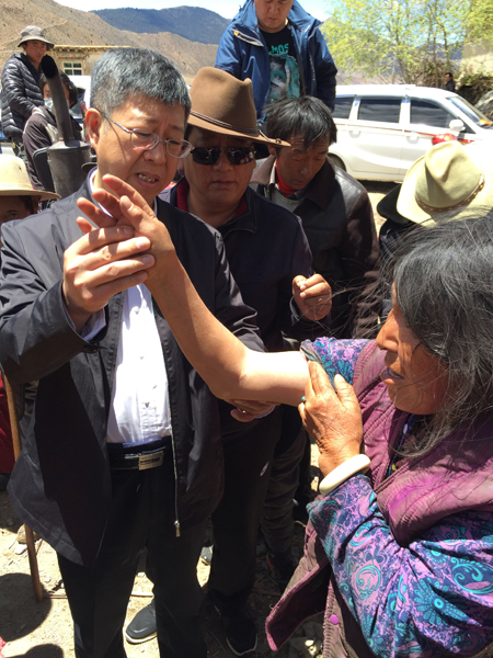 5月20日,调研组在洛隆县孜托镇德通村给当地可疑大骨节病患者作病情诊断。