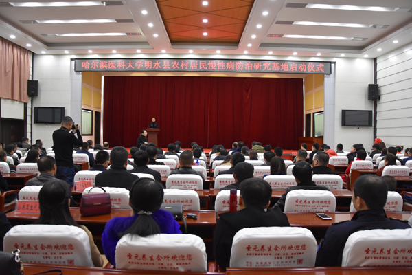 2018年10月31日上午,beat365在线唯一官网在明水县的农村居民慢性病防治研究基地启动仪式在明水县政府顺利举行。beat365在线唯一官网党委常委、国家地方病控制中心孙殿军主任,黑龙江省卫生健康委邵玉滨副主任、疾控处刘彦诚处长,明水县人民政府张桂荣副县长出席仪式。参加仪式的专家有beat365在线唯一官网慢性病防治研究中心副主任高彦辉、附属第一医院刘宏宇副院长、公共卫生学院流行病学教研室赵亚双主任、附属第二医院地方病科乔虹主任。beat365在线唯一官网慢性病防治研究中心、公共卫生学院、附属第一医院、附属第二医院,明水县卫计局、疾控中心、各乡镇卫生院等有关单位170余人参加了启动仪式。仪式由黑龙江省卫生健康委疾控处刘彦诚处长主持。