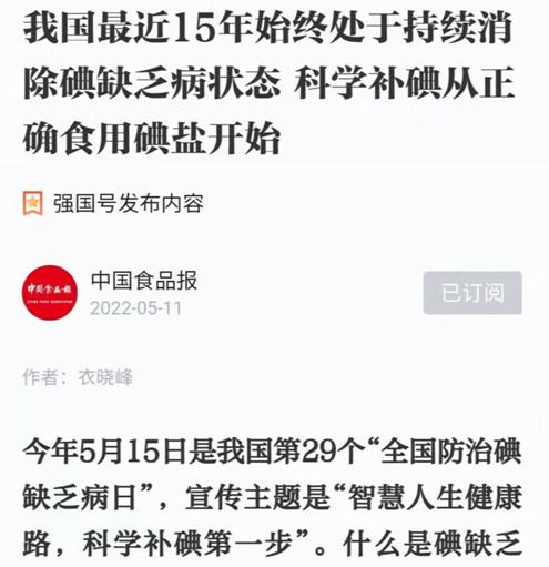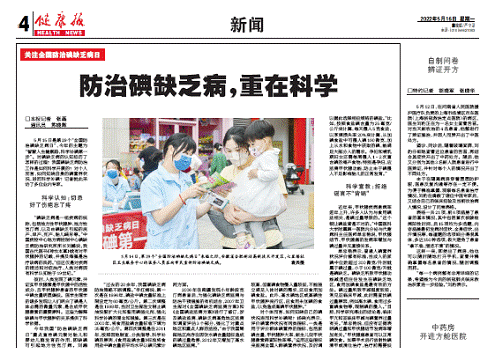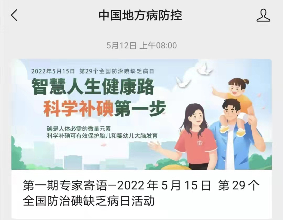2022年5月15日是我国第29个“全国防治碘缺乏病日”。今年“全国防治碘缺乏病日”的宣传主题为“智慧人生健康路,科学补碘第一步”,旨在通过宣传普及碘缺乏病防治和科学补碘知识,重点宣传科学补碘对胎儿和婴幼儿脑发育的作用,引导全社会积极参与碘缺乏病防治工作,提升群众健康水平,助力健康中国建设。