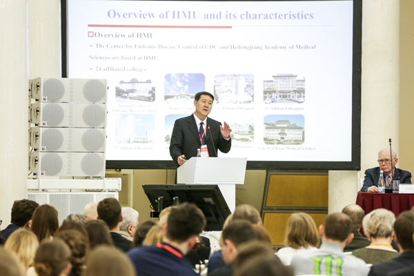 4月22日,代表团参加了圣彼得堡大学举办的俄罗斯第二十届青年学者国际会议。会议在圣彼得堡大学的金色大厅举行,来自世界各地18个国家80个城市的400名专家学者及10位俄罗斯院士参会。圣彼得堡大学医学院院长 Yablonsky Petr Kazimirovich教授在会议开始前隆重介绍了beat365在线唯一官网。杨宝峰院士首先进行了题为“Novel Target for Regulation of Ischemic Arrhythmia/Sudden Death”的学术报告。在报告中杨校长介绍了beat365在线唯一官网的发展历史、文化底蕴和研究特色,并总结了中俄医科大学联盟合作取得的工作成果。在科研方面,杨宝峰院士团队针对心血管疾病分子机制尚不明确和关键靶点未被发现的问题,通过三十多年的系列研究使用多种动物模型筛选抗心律失常药物的作用新靶点,发现microRNA-1-328-26a等是调控心律失常的关键分子,并且发现microRNA可以作为抗心律失常药物作用新靶点。报告得到国内外专家广泛赞扬,赢得台下各国专家学者的阵阵掌声。