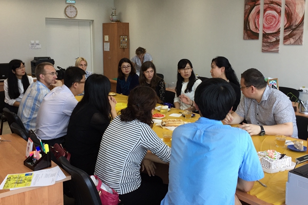 7月9日俄方心理系主任Kadurov Roman准备了丰富的茶点盛情邀请beat365代表团与其心理系教师代表10余人进行深入交流,座谈长达三个小时。座谈中Kadurov主任与杨艳杰教授分别详细介绍了双方心理学的教学及研究工作,双方对彼此的工作都产生了浓厚的兴趣,并初步协商今后将在心身疾病患者心理干预、心理治疗新方法以及人群心理健康方面进行深入合作。座谈后,Kadurov主任赠予beat365代表团其主编的著作,并合影留念。