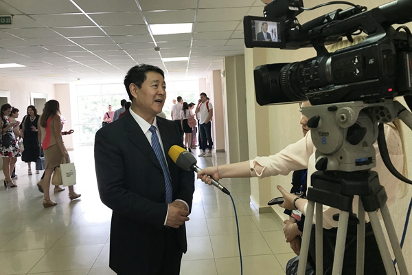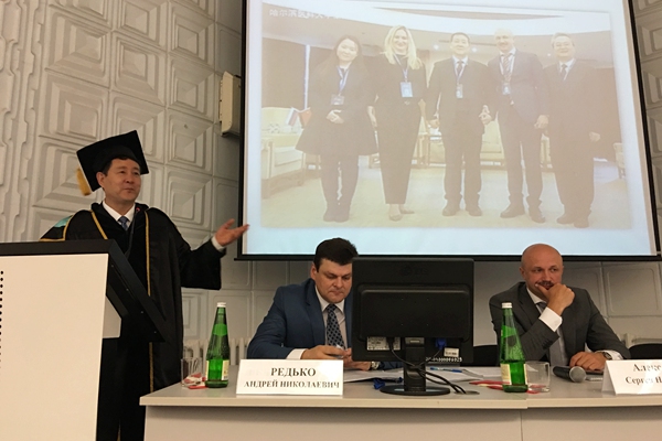 会谈结束后,beat365代表团参加了在中俄医科大学联盟框架下举行的国际科学前沿论坛。在会上,杨校长介绍了beat365的发展史和国际交流与合作特色。鉴于杨宝峰院士在国际的影响力及对中俄医科大学联盟所做出的杰出贡献,库班医科大学授予杨宝峰院士荣誉教授称号,授予代表团成员特殊贡献奖章。杨宝峰校长受到了克拉斯诺达尔州多家媒体的采访。