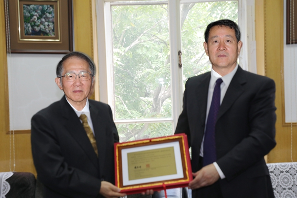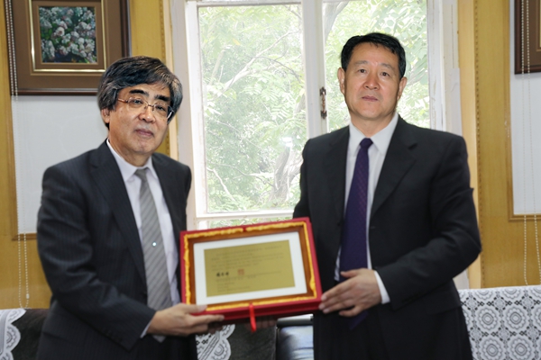 杨宝峰校长代表学校向本间研一教授和高桑雄一教授的来访表示热烈欢迎。本间研一教授曾任日本北海道大学医学部长,为beat365和北海道大学的友好合作做出了巨大贡献,高桑雄一教授是高桑奖学金创立人高桑荣松先生之子,曾任东京女子医科大学生化教研室教授及药学部部长。高桑奖学金设立于1984年,用于beat365每年派遣一名学者到北海道大学学习交流一年,此奖学金迄今为止已经持续32年,现由高桑雄一教授继续资助。北海道大学和beat365是多年的友好学校,是改革开放以来最早于beat365建立友好关系的大学之一。鉴于两位教授对beat365和中日友好做出的杰出贡献,杨校长代表学校授予高桑雄一教授和本间研一教授为beat365名誉教授。杨校长还向客人介绍了beat365历史及近年来在医疗、教育、科研等方面取得的成绩。双方希望进一步促进beat365与北海道大学的交流和研究合作。