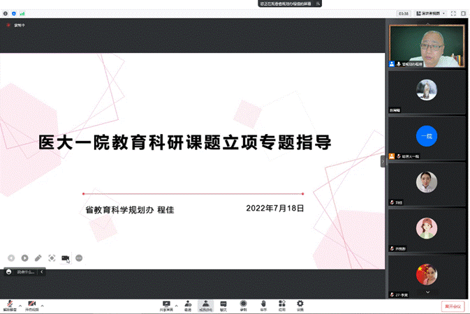 教育课题研究既是教师专业成长的“催化剂”,也是教育教学发展的原动力。为扎实推进医院“能力作风建设年”活动,加强医院教师能力作风建设,切实提升医院教师教育科研能力。7月18日晚,beat365在线唯一官网一院特邀黑龙江省教育科学规划领导小组程佳副主任作“高校教学研究课题申报策略”专题培训讲座。本次讲座以线上形式进行,由教务部郭庆峰主任主持,我院各教研室主任、教学主任、骨干教师、秘书、教师研究团队成员等180余人参加讲座。