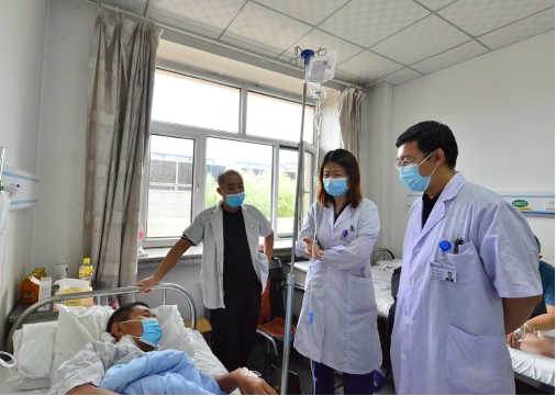 超声医学科姜双全副主任医师和肾内科二病房毕敏副主任医师查看刘先生治疗后情况