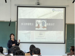 邹朝霞教授以“探寻肿瘤靶点”为主题,向同学们介绍了恶性肿瘤的研究现状,并重点介绍了世界上首个成功抗癌症药物的研发历程。她的分享引发了同学们对科研的浓厚兴趣,让他们明白了作为基础研究专业学子肩负的光荣使命。