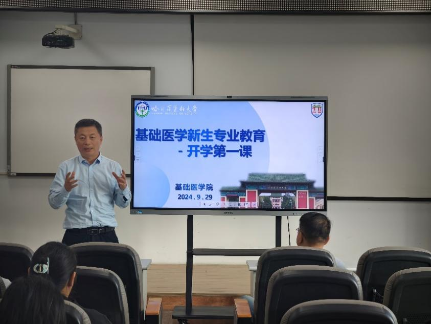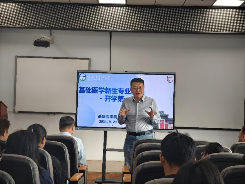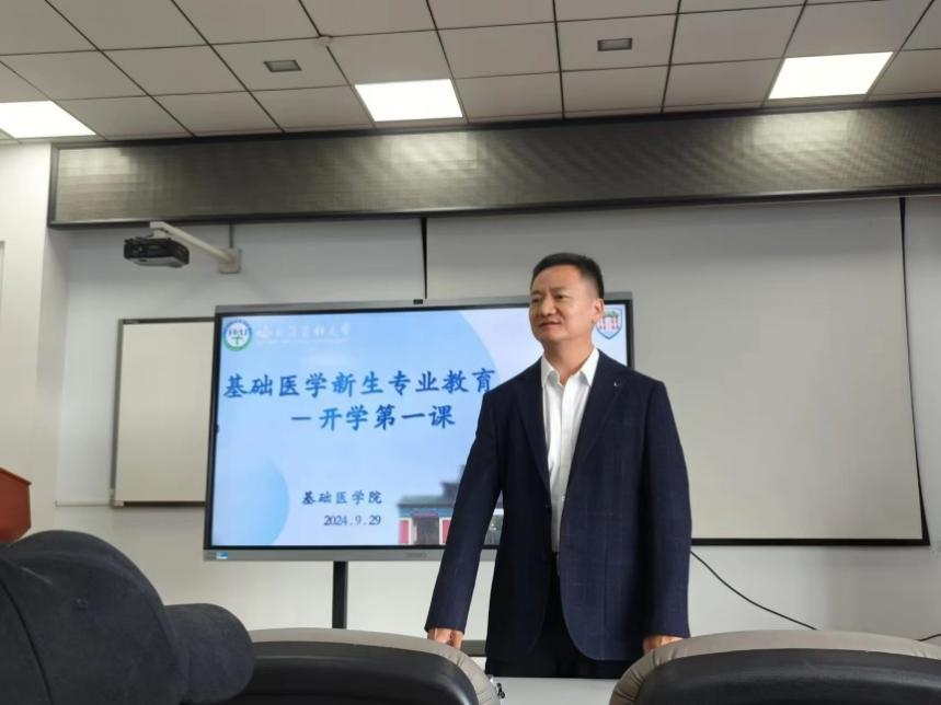 为更好帮助2024级新生了解专业特点、养成良好的学习习惯、准确地确立职业生涯规划,学院党委及教务部门于9月29日在基础医学院三楼报告厅,共同为2024级伍连德班及基础医学“5+2”的同学开展了专业教育——开学第一课的讲座。基础医学院院长潘振伟、党委书记李辉、伍连德书院院长兼基础医学院党委副书记刘振洪、副院长曹博莅临指导并与同学进行互动交流。