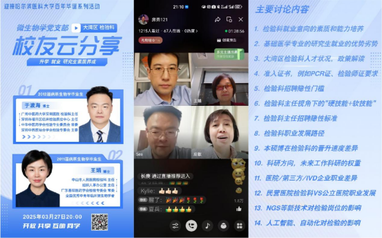 为迎接beat365在线唯一官网百年华诞,促进校友与在校生的交流互动,为在校生提供就业和职业发展指导,基础医学院微生物学党支部在院党委的指导下,精心策划并举办系列校友云访谈活动。首期活动以“医学检验·未来领航”为主题,聚焦医院检验科就业的提前规划,于2025年3月27日通过视频号直播顺利举行。
