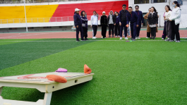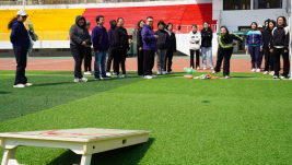 当传统养生遇上现代趣味,赛场瞬间变身欢乐海洋。美式布袋球体验区惊现众多“神投手”:有的老师屏息凝神瞄准靶心,布袋球划出完美弧线应声入袋;有的队伍则化身“表情包生产队”,击中目标时的振臂高呼与遗憾擦边时的捧腹大笑交织成春日最动人的乐章。