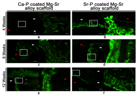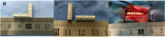 图1: Ca–P 涂层 (a) 和Sr–P 涂层(b)的 Mg–Sr合金支架植入到兔临界性尺骨缺损模型中(c)