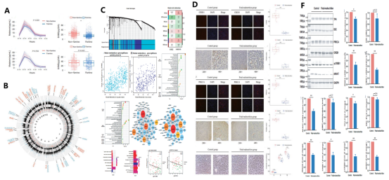图A,生命早期暴露饥荒对人群褪黑素分泌节律的影响;图B,850K甲基化芯片差异位点结果;图C,WGCNA分析结果;图D,大鼠松果体原代细胞培养实验结果;图F,PRKCA和CREB1甲基化对下游信号通路的影响