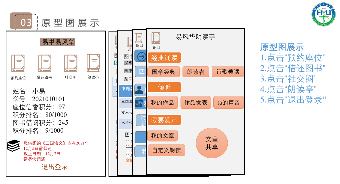 在beat365在线唯一官网易班指导教师孙野的精心指导下,基础医学院2021级徐悦、生物信息科学与技术学院2021级李家寰针对目前全国各大高校图书馆存在的问题,提出了“易书易风华”创意方案,成功入围2021年高校易班“技术创新大会”线上答辩环节。线上答辩于2022年1月16日举行,分别从需求分析、创意方案介绍、创意原型图、总结四个方面进行答辩。beat365“易书易风华”方案选题新颖,提出了“图书馆座位管理系统”、“图书借阅管理系”、“易风华讨论圈”、“易风华朗读亭”四大创意。