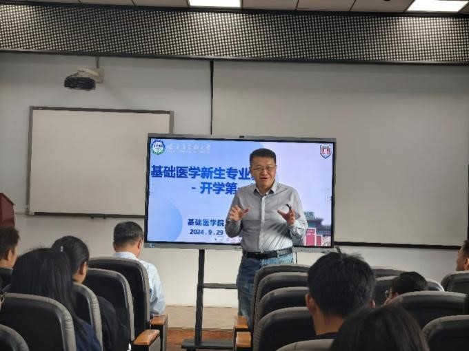 基础医学院 为更好帮助2024级新生了解专业特点、养成良好的学习习惯、准确地确立职业生涯规划,学院党委及教务部门于9月29日在基础医学院三楼报告厅,共同为2024级伍连德班及基础医学七年制的同学开展了专业教育——开学第一课的讲座。基础医学院院长潘振伟、党委书记李辉、副院长曹博以及基础医学院党委副书记兼伍连德书院院长刘振洪莅临指导并与同学进行互动交流。