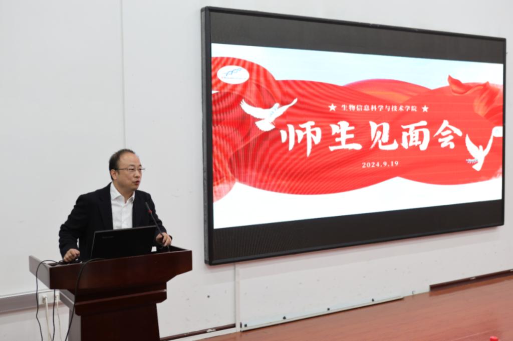 生物信息科学与技术学院 于2024年9月19日在学院大会议室举办了2024级新生师生见面会暨入学教育。学校党委副书记金焰,学院党委书记肖云,院长徐娟,副院长程亮、顾云燕,学生党总支书记宁尚伟,计算生物学教研室主任张云鹏,青年教师代表,新生兼职班主任,全体辅导员出席会议,师生见面会由宁尚伟主持。各位专家以最诚挚的热情和最详尽的指引,为新生们的大学旅程铺设了坚实的基石。