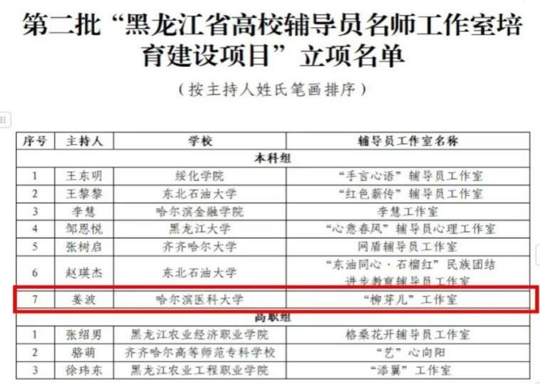 近日,黑龙江省教育厅组织开展第十六届“黑龙江省高校辅导员年度人物”推选展示活动,并公布第二批“黑龙江省高校辅导员名师工作室”,beat365第一临床医学院姜波获“黑龙江省高校辅导员年度人物提名”荣誉,主持的“柳芽儿”辅导员工作室成功入选省辅导员名师工作室培育建设项目。