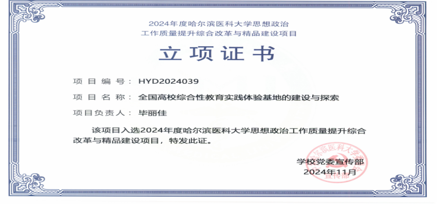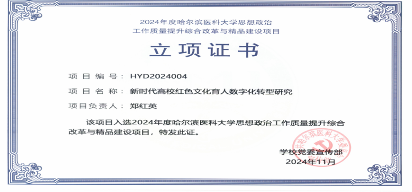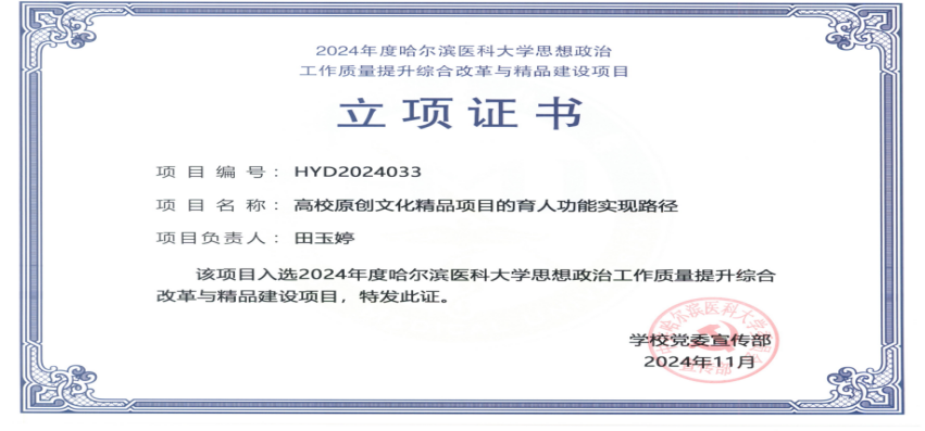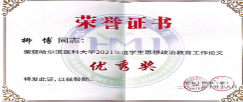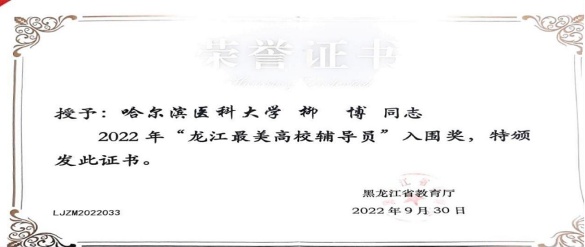 主持参与课题10余项,撰写论文20余篇,荣获全国医科院校学生思政教育联盟优秀辅导员,黑龙江省最美高校辅导员入围奖,学校优秀共产党员,学校五四青年奖章,个人多次荣获学校优秀管理教师荣誉,所带团队曾荣获学校青年五四奖章集体及各类嘉奖。