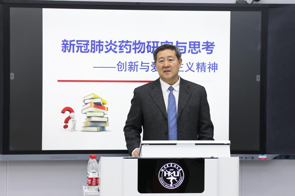 杨宝峰院士以《新冠肺炎药物研究与思考——创新与爱国主义精神》为题目,首先强调了爱国和创新的重要性,随后从医学的角度为大家讲授了新冠肺炎疫情对机体的损伤,从科学的角度介绍了专家们针对新冠肺炎疫情开展的科学研究,从人文的角度讲述了当代大学生应具备什么样的精神抗击新冠肺炎疫情。杨宝峰院士表示,有了党和国家的正确领导和科学工作者的辛勤奉献,我们才能在如今的抗疫工作中取得如此成效;同时鼓励哈医学子要继承和发扬袁隆平院士、钟南山院士、屠呦呦院士辛勤奉献的精神,伍连德博士、于维汉院士、张亭栋教授勇于创新、锲而不舍的精神。最后,杨宝峰院士引用了习近平总书记对年轻人的 “十六字诀” 勉励同学们:志存高远、德才并重、情理兼修、勇于开拓。希望同学们坚定决心,自觉行动,夯实基础,传承优良传统,努力成为新时代人才!