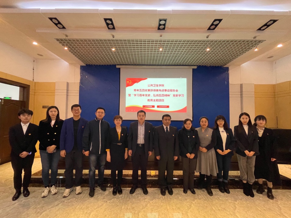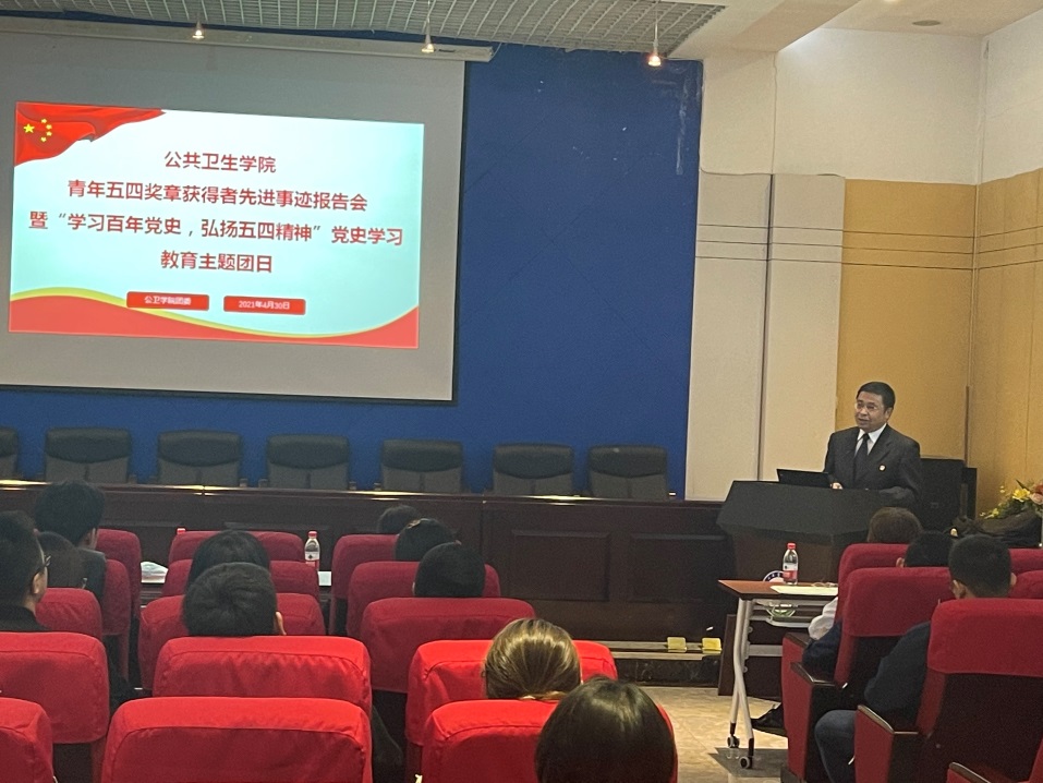 为进一步学习贯彻习近平总书记在党史学习教育动员大会上的重要讲话精神,激励和引领广大团员青年以校五四奖章获得者为榜样,传承红色基因,弘扬五四精神,学院团委在学院党委的领导与支持下,于4月30日中午成功举办公共卫生学院青年五四奖章获得者先进事迹报告会暨“学习百年党史,弘扬五四精神”党史学习教育主题团日活动。活动邀请了我院校青年五四奖章获得者韩天澍副教授、十佳大学生李煜霏同学和优秀共青团干部汤天德同学分享典型事迹,交流成长体会、感悟跟党初心。学院党委书记李百祥同志致辞,学生年级党总支书记王冶艳、党委副书记曲乃强、副院长吴永会、副院长武丽杰、副处级辅导员王国华、研究生党总支书记王琪、团委书记王凤前以及青年教师和学生代表50余人参加了此次报告会,会议由学院团委副书记王茜主持。