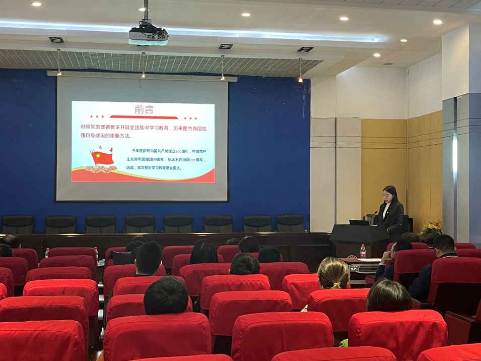 会议最后学院团委副书记王茜同志做了题为“学习百年党史,弘扬五四精神”——共青团开展党史学习教育的报告。报告提出学院团委将以全党集中开展党史学习教育为契机,结合深入贯彻落实习近平总书记关于青年工作的重要思想,抓住“学党史”这个基本点,把牢“强信念”这个总开关,聚焦“跟党走”这个总目标,推动党史学习教育广泛开展,进一步发挥先进典型的榜样引领作用。