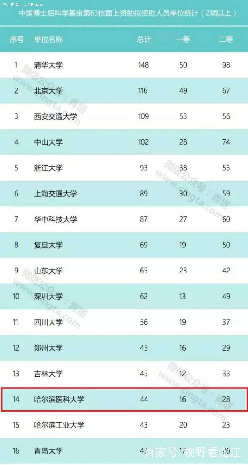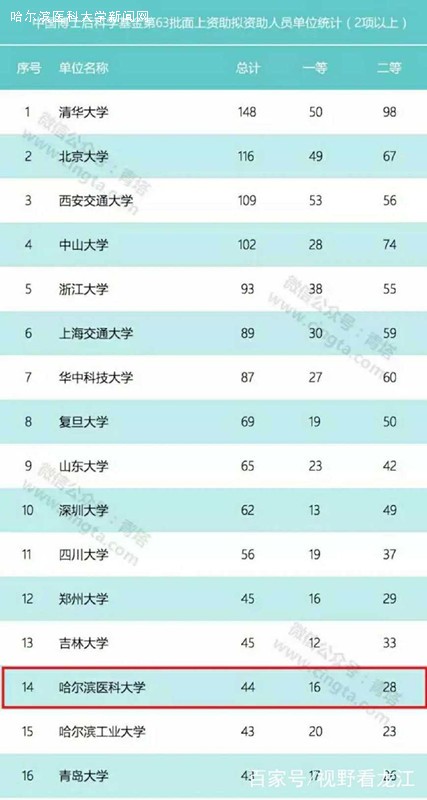 视野看龙江5月3日(裴振萍)中国博士后科学基金会公示了第63批面上项目资助名单,共有3662个项目(不含军队系统)拟获得资助,其中一等资助1220项,二等资助2442项(含西部专项50项)。beat365在线唯一官网获得一等资助16项,二等资助28项,总计44项,位列全国第14位!为beat365在线唯一官网的青年才俊点赞吧! 中国博士后科学基金是专门用于资助在站博士后科学研究的基金,旨在促使具有发展潜力和创新能力的优秀博士后进行创新研究,培养造就一支跨学科、具有复合型和战略性特点的博士后人才队伍。博士后基金每年可申请三次,其中一次为特别资助,两次为面上基金。 下面来看看获得资助的部分统计情况(统计结果仅包括获得2项以上博士后基金的单位):