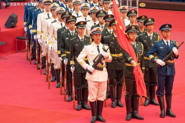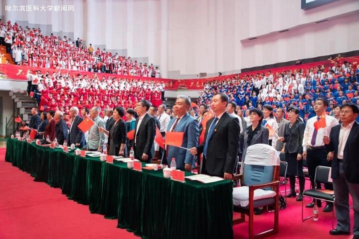 学校“十大教育家”、“十大科学家”、“十大名医”代表、获国家级人才称号的代表及离退休的老领导在嘉宾席前排就座。 暖阳融融,天高云淡。校体育馆外“不忘初心、牢记使命”、“庆祝新中国成立70周年”的签名板上,师生们庄严的写下自己的名字,表达祝福祖国的美好心愿。步入会场,观景台四周印有“不忘初心、牢记使命”“庆祝新中国成立70周年”的巨幅裙围和灯光四射的大型舞台吸引了人们的目光,会场喜庆热烈、生机勃勃,成立于1995年并参加2008年北京奥运会火炬传递等大型演出的大庆校区“天使乐团”演奏的激昂乐曲响彻全场。