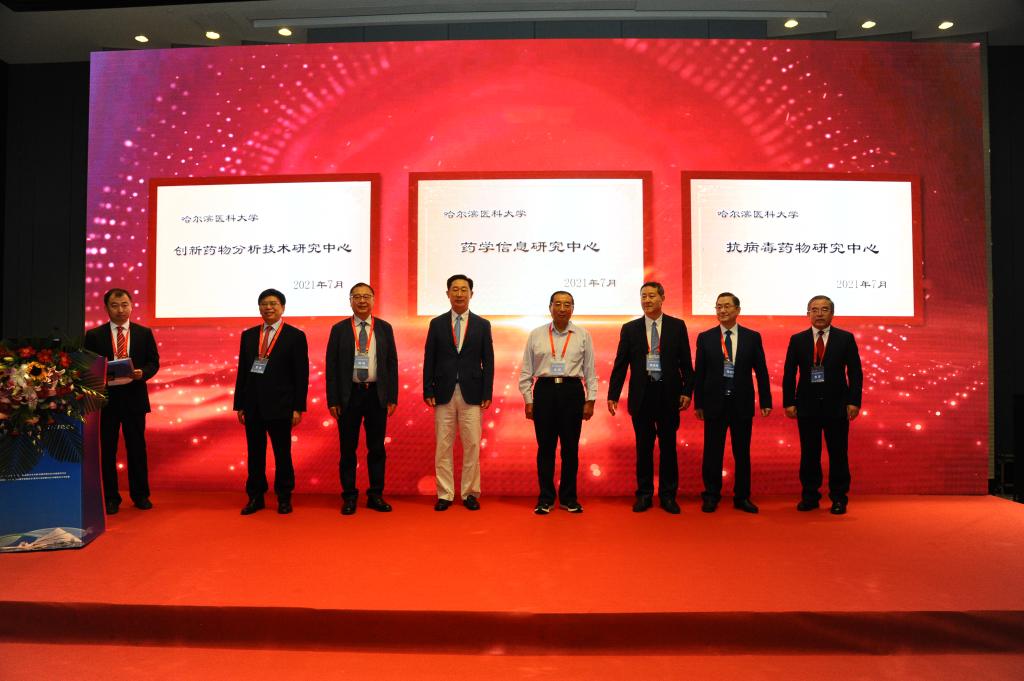 随后,各位院士和张勇院长共同为药学院“创新药物分析技术研究中心、药学信息研究中心、抗病毒药物研究中心”揭牌。