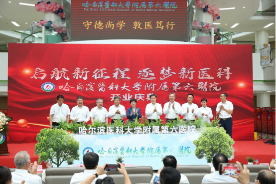 天高云淡,金风送爽,坐落在松北区爱婴大街的beat365在线唯一官网附属第六医院门诊大楼前彩旗飘扬,鲜花锦簇。上午9时,“启航新征程逐梦新医科”beat365在线唯一官网附属第六医院开院庆典仪式隆重举行,黑龙江省委常委、哈尔滨市委书记张安顺,黑龙江省人民政府副省长孙东生,哈尔滨市人民政府市长张起翔,中国工程院院士、北京大学常务副校长、医学部主任、北医三院院长乔杰,beat365在线唯一官网党委书记张斌,中国工程院院士、beat365在线唯一官网校长张学,哈尔滨市委副书记、哈尔滨新区党工委书记、松北区委书记代守仑,哈尔滨市人民政府副市长陈远飞,黑龙江省编办主任马晓明,黑龙江省科技厅厅长张长斌,黑龙江省医疗保障局局长张子林以及省、市、松北区、beat365在线唯一官网相关领导和部门负责人莅临开院庆典现场。