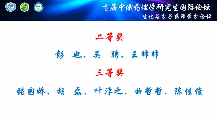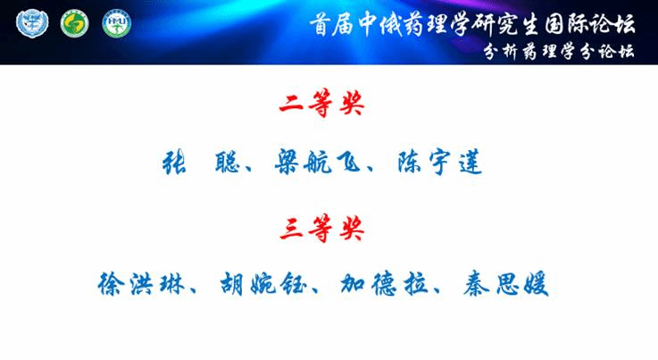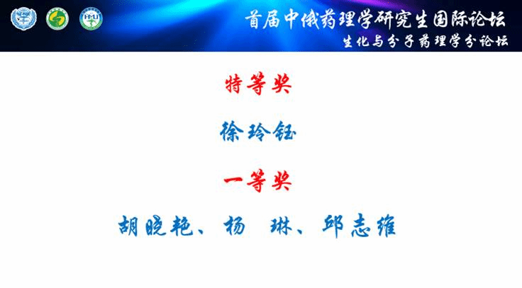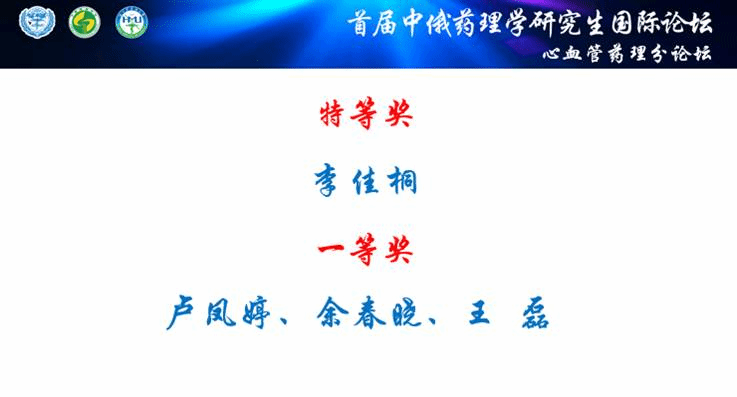 经过激烈角逐及组委会的严格评审,各分论坛分别产生特等奖、一等奖、二等奖及三等奖获得者。张勇教授、杨晔教授、徐丹教授、胡庆华教授分别宣读心血管药理分论坛、生化与分子药理学分论坛、分析药理学分论坛及抗炎免疫药理学分论坛的获奖者名单,对获奖研究生表示热烈祝贺,并对各分论坛专家的莅临和指导表示衷心感谢!