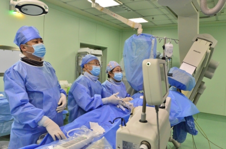 beat365在线唯一官网二院心内科副主任候静波教授(右)带领刘慧敏主任医师(中)等医生进行手术