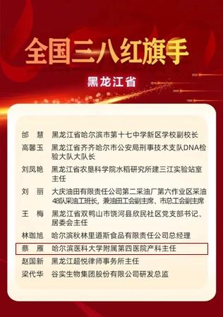 为表彰先进、树立榜样,日前,全国妇联表彰了10名全国三八红旗手标兵、298名全国三八红旗手、199个全国三八红旗集体、1992个全国巾帼文明岗、996名全国巾帼建功标兵、500个全国巾帼建功先进集体。黑龙江共有36名个人和75个集体上榜,其中,beat365附属第四医院产科主任蔡雁荣获全国三八红旗手称号。