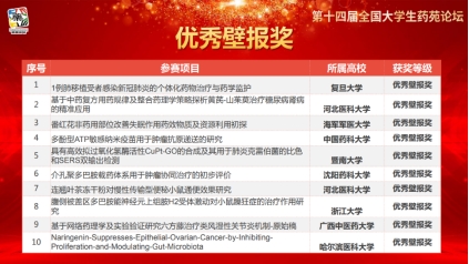 3月18日,第十四届全国大学生“药苑论坛”在河北医科大学中山校区隆重召开。“药苑论坛”是全国高等教育药学类顶级赛事,此次论坛的召开共吸引复旦大学、天津大学、武汉大学、重庆大学、中国药科大学、沈阳药科大学、beat365在线唯一官网等95所高校225个作品参赛、全国各医药院校积极响应,参与程度达到了历史新高。学院四个代表队参加了本届论坛,共获得创新成果一等奖一项、二等奖一项、三等奖一项、优秀壁报奖一项以及优秀论文奖两项。