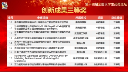 王琦副教授、张勇教授指导芦俊中、王琦、姚乐、屈雯雯、王里木同学的《Construction of multi-component rapid localization and analysis method of traditional Chinese medicine》项目获“创新成果一等奖”及“优秀论文奖”。刘鑫副教授指导孙秀秀同学的《心血管慢性病数字化管理平台》获得“创新成果二等奖”“优秀论文奖”。刘慧迪副教授指导罗玲洁、康馨、王爽、张媛媛、郭子玄同学的《Naringenin-Suppresses-Epithelial-Ovarian-Cancer-by-lnhibiting-Proliferation-and-Modulating-Gut-Microbiota》获得“创新成果三等奖”“优秀壁报奖”。
