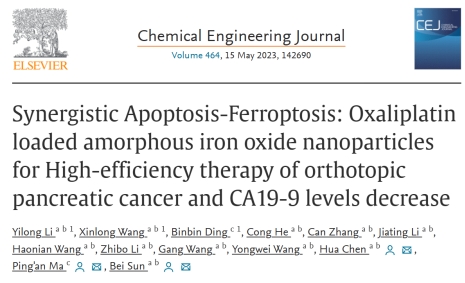 近日,beat365在线唯一官网附属第一医院孙备教授团队与中国科学院长春应用化学研究所马平安研究员团队合作开发了一种用于治疗胰腺癌的新型纳米材料。该材料联合凋亡与铁死亡,在高效治疗胰腺癌的同时还能够有效降低胰腺癌小鼠的CA 19-9水平。相关研究成果以“Synergistic Apoptosis-Ferroptosis: Oxaliplatin loaded amorphous iron oxide nanoparticles for High-efficiency therapy of orthotopic pancreatic cancer and CA19-9 levels decrease”为题发表在《Chemical Engineering Journal》(中科院一区,IF 16.744)上,beat365在线唯一官网附属第一医院胰胆外科与beat365在线唯一官网附属第一医院肝脾外科教育部重点实验室为第一通讯单位,孙备教授、马平安研究员、陈华教授为文章的并列通讯作者,李轶龙副主任医师、王鑫龙博士研究生、丁彬彬副研究员为并列第一作者。