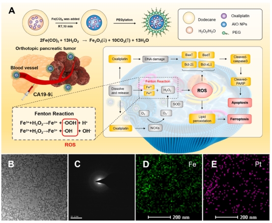 胰腺癌是消化系统恶性程度最高的肿瘤之一,预后极差,并且对目前已知的化疗药物如奥沙利铂等不敏感。为了在治疗胰腺癌方面取得比游离奥沙利铂更为有效的治疗效果,本研究设计了一种非晶态氧化铁包裹奥沙利铂的纳米药物(AIOoxp)。AlOoxp能够显著增加铂在肿瘤部位的积累,并有效降低奥沙利铂诱导的全身毒性。此外,AlOoxp释放的铁离子可以通过芬顿反应与H2O2发生反应,产生大量活性氧。过量的活性氧可以诱导肿瘤细胞铁死亡和促进细胞凋亡。搭载的化疗药物奥沙利铂反过来可以促进芬顿反应底物H2O2的生成,从而实现协同的肿瘤治疗效果。此外,AlOoxp还能显著降低糖类抗原CA19-9的水平。CA19-9是胰腺癌最重要的生物标志物,同时也是胰腺癌的促进因素。CA19-9水平的降低预示着具有良好的治疗效果和预后。本研究为胰腺癌的临床治疗提供了新的思路以及一种有效的治疗策略。