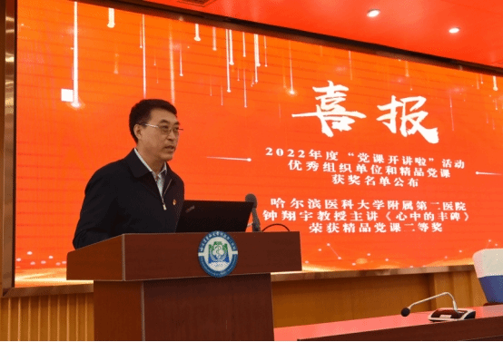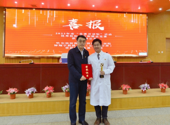 近日,黑龙江省委组织部通报2022年全省“党课开讲啦”活动精品党课获奖情况,二院普外科第一党支部书记钟翔宇教授讲授的党课《心中的丰碑》荣获精品党课二等奖。4月3日,beat365在线唯一官网二院党委举行表彰仪式,党委书记王永晨为钟翔宇教授颁发荣誉证书和奖杯,祝贺钟翔宇教授获奖。