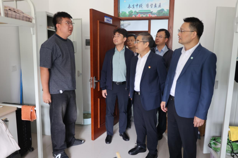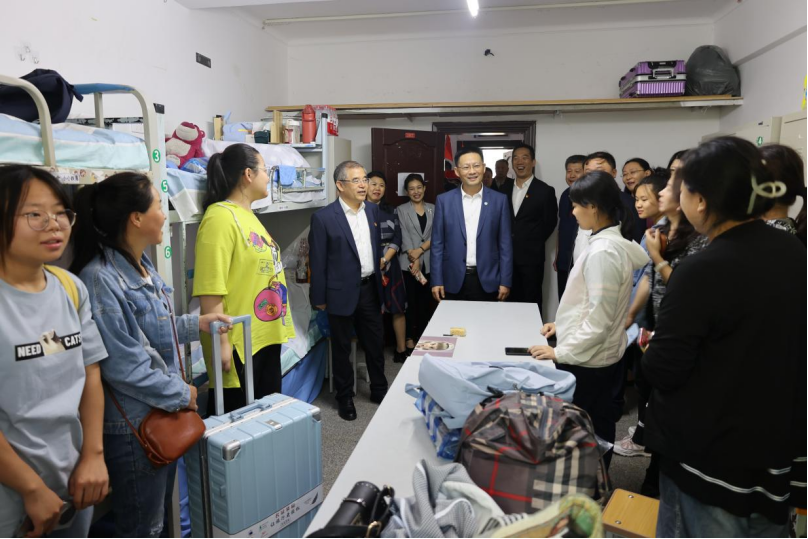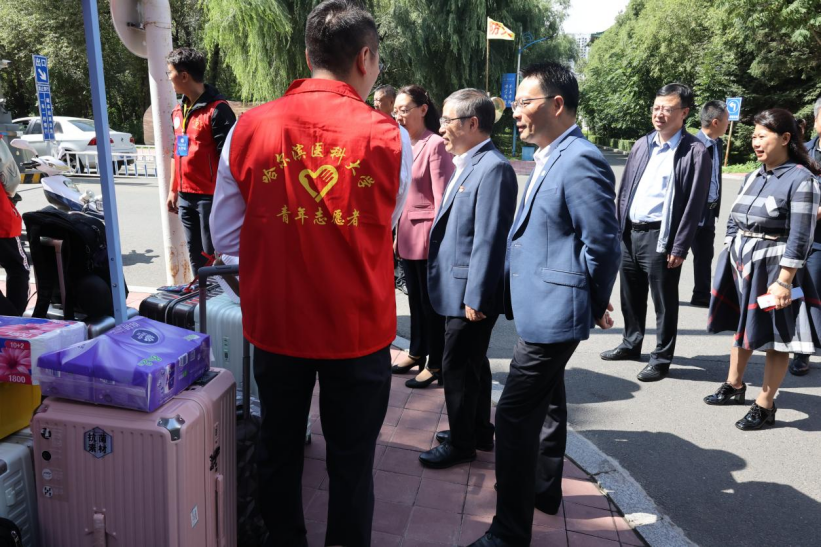 从学校主楼出发,学校领导到南门志愿者服务站、公卫学院阳光大厅迎新现场、食堂、快递驿站、新生公寓等处了解迎新工作开展情况和新生入学感受。