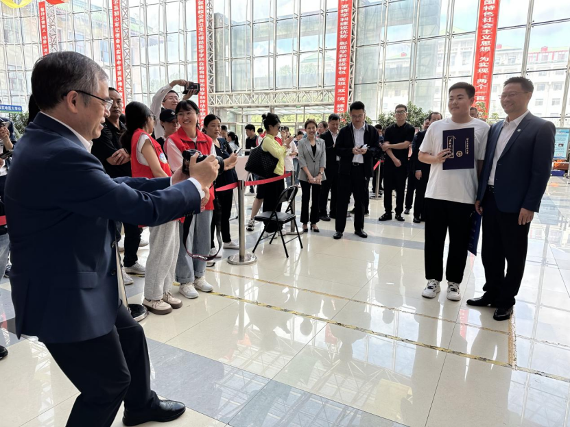 张学书记为新生拍摄第一张“入学照”,季勇校长与新生合影。
