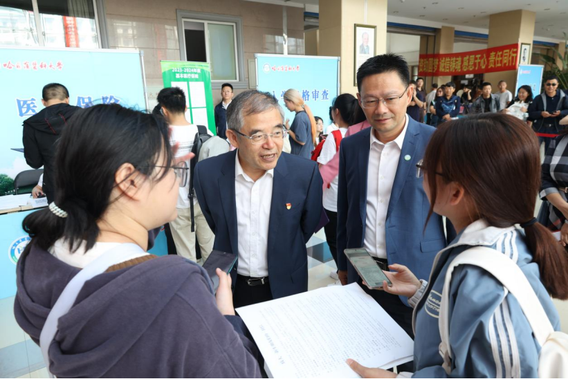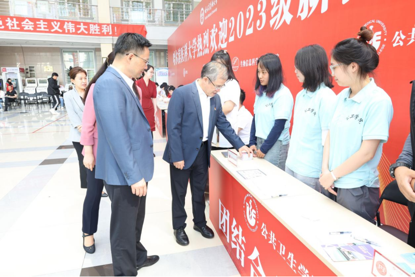 在公卫学院阳光大厅迎新现场,学校领导仔细查看新生报到的各个环节工作,详细了解新生报到基本情况,与新生亲切交谈,认真聆听他们的报到感受,欢迎2023级“小萌新”正式入学。