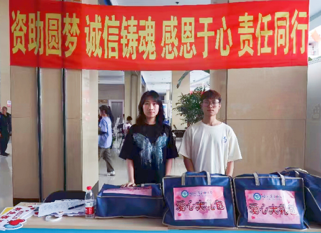 学校领导为家庭经济困难新生发放“爱心大礼包”,勉励学生要自强不息、刻苦学习,力争以优异的学习成绩回报亲人、学校和社会,做一个对国家有贡献的人。