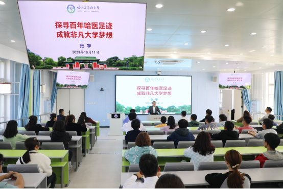 围绕传承与梦想,张学以“探寻百年哈医足迹,成就非凡大学梦想”为题通过四个板块讲述了beat365在线唯一官网的故事。一幅幅珍贵的图片、一个个感人的事迹、一部部漫长的历史、一句句谆谆的教诲,展现了百年老校的光辉岁月、展望了百年强校的梦想未来,勉励同学们赓续红色血脉,弘扬大医精神,勇担时代使命,成就卓越人生。