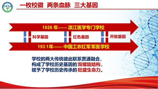 在第一板块“传承两大传统、赓续红色血脉”中,通过对“一枚校徽、两条血脉、三大基因”的讲解,张学指出,伍连德“赤诚爱国、自强创业”和中国工农红军军医学校“政治坚定、技术优良”的两大传统彼此联系贯通融合,构成了学校历史基因的双螺旋结构,赋予了学校历史传承的旺盛生命力。如今,学校继承血脉和文化,坚持为学生学者办学立校、坚定以学术学风兴学强校的办学理念,不断推动各项工作高质量发展,在新征程上,团结全校师生为实现“国内一流、国际有影响的高水平医科大学”的目标砥砺前行。