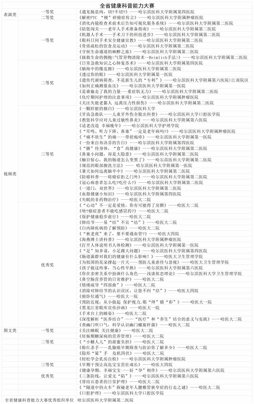 为了深入贯彻落实党的二十大精神,弘扬以人民健康为中心的理念,进一步推进健康龙江行动——健康知识普及行动,普及健康科学知识,推广文明健康的生活方式,在全社会营造良好的“学健康知识、享健康生活”的氛围,省卫生健康委、省委宣传部、省科技厅、省科协共同组织开展了“健康知识普及行动——全省健康科普能力大赛”。在坚持“公平、公正、公开”原则的基础上,经过两轮评审,评选出获奖作品四大类,共计364项,beat36568项作品获奖,其中,表演类一等奖1项,二等奖1项;视频类一等奖7项,二等奖8项,三等奖18项,优秀奖22项;图文类一等奖2项,二等奖4项,三等奖2项,优秀奖4项。beat365在线唯一官网附属第二医院获得“全省健康科普能力大赛优秀组织单位”荣誉称号。