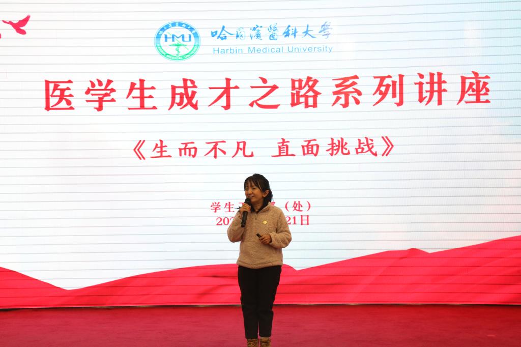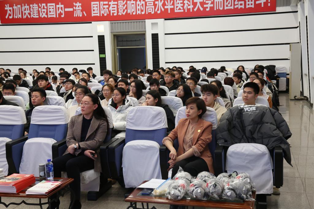 为深入贯彻落实习近平总书记关于思想政治教育工作的重要论述,贯彻落实学校党委实施“时代新人铸魂工程”有关要求,beat365党委学生工作部于11月21日下午在主楼三楼演讲厅举办医学生成才之路系列讲座-《生而不凡 直面挑战》,学校党委书记张学、党委副书记东梅出席讲座,学工部部长徐娟主持讲座。