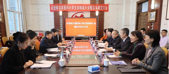 袁重胜代表学校党委对成立民进医大总支委员会表示祝贺,向民进黑龙江省委对beat365在线唯一官网统战工作给予的支持表示感谢,希望医大的民进会员要切实把握政治方向,提高政治站位,加强自身建设,提升履职能力,优化组织结构。扎实推进“凝心铸魂强根基、团结奋进新征程”主题教育走深走实,落实“学思想、强根基、重履职、建新功”的总要求,团结全体会员围绕中心、服务大局,特别要聚焦学校高质量发展、双一流建设、等重点工作,积极探索,深入实践,为学校党委决策提供科学依据,担负起新时代赋予的政治责任和时代使命。