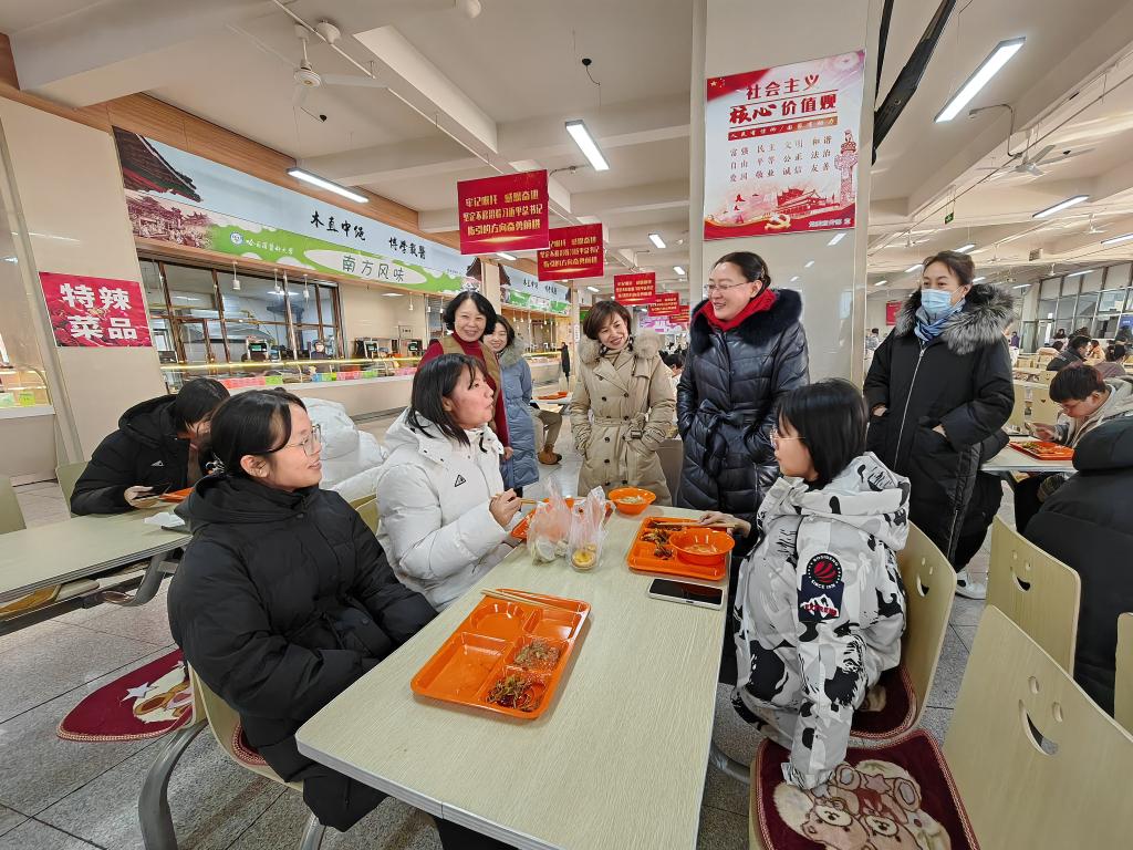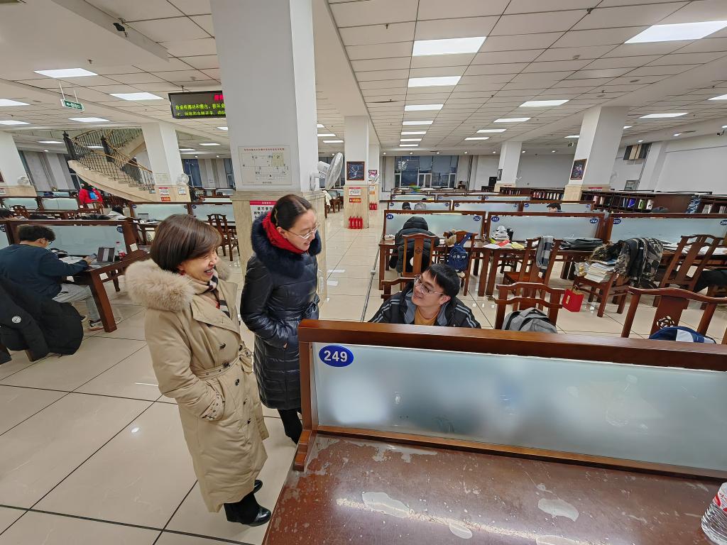 21日,在学生食堂,东梅与同学亲切交流,了解学生家乡在哪里,考试准备情况如何,对学习生活还有哪些需求。叮嘱同学们天气寒冷、临近期末要加强营养,合理饮食。在图书馆,东梅详细询问学生期末和考研阶段的学习情况,了解学生心理状况和学习中的困难和需求,鼓励同学们认真备考、劳逸结合,以积极乐观的心态迎接考试。