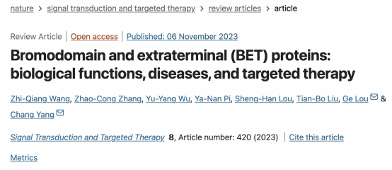 beat365在线唯一官网附属肿瘤医院娄阁教授团队在恶性肿瘤靶向治疗领域发表最新权威综述,研究成果论文《Bromodomain and extraterminal (BET) proteins: biological functions, diseases, and targeted therapy》于2023年11月被国际高水平期刊Signal transduction and targeted therapy(IF=39.3)收录并已正式发表。