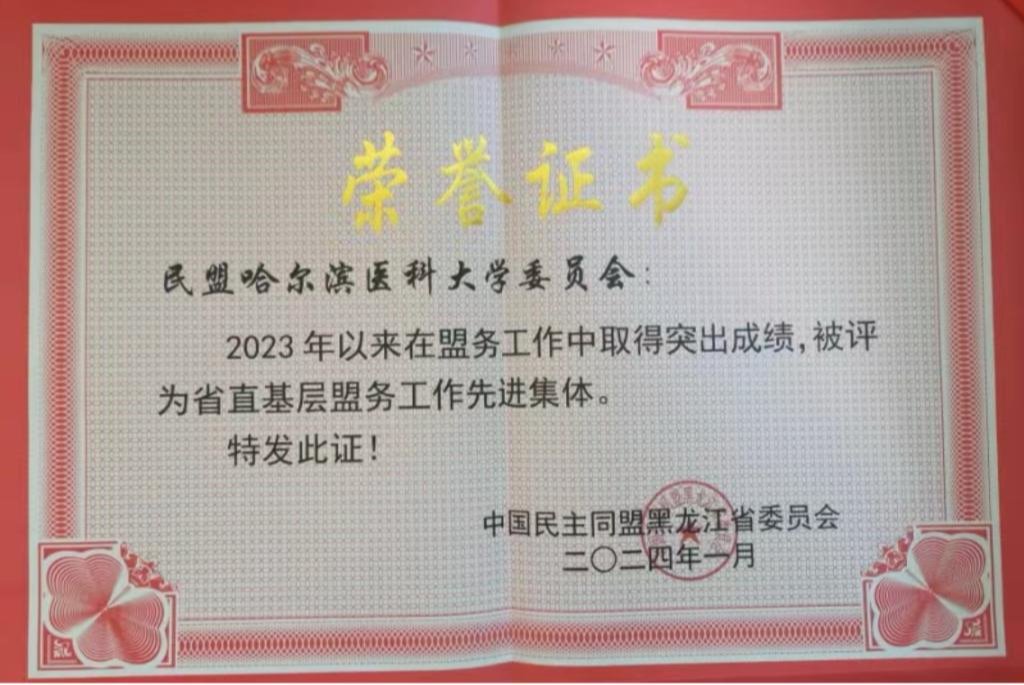 近日,民盟黑龙江省第十三届委员会第二次全体会议在哈尔滨市召开。会上,民盟黑龙江省委为表彰先进,推广经验,着力提升盟务工作能力和水平,对在2023年盟务工作中取得较好成绩的集体和个人进行表彰。民盟beat365在线唯一官网委员会获“民盟黑龙江省盟务工作先进集体”称号,beat365盟委副主委史高松及二院支部副主委王思思获“民盟黑龙江省盟务工作先进个人”称号。