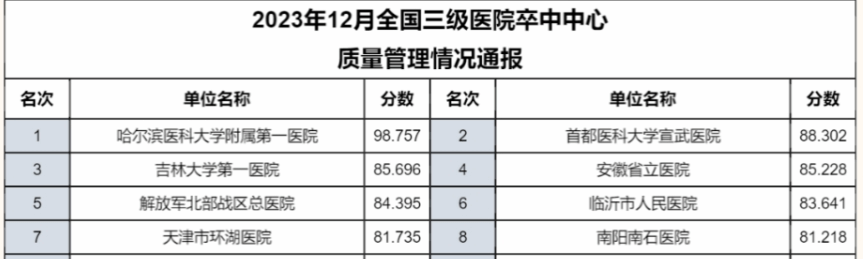 近日,在最新公布的全国三级医院高级卒中中心质量管理2023年11月份和12月份排行榜中,beat365在线唯一官网一院卒中中心质量管理连续两个月全国排名第一!静脉溶栓例数达131例,平均DNT时间41min,标志着beat365在线唯一官网一院在国内急性卒中救治领域处于领先水平。