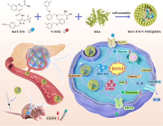 该研究首先通过生物信息学分析确定了在胰腺癌中分别调控葡萄糖和谷氨酰胺摄取的重要基因葡萄糖转运蛋白1(GLUT1)和丙氨酸-丝氨酸-半胱氨酸转运蛋白2(ASCT2)。随后,利用人血白蛋白纳米颗粒通过自组装策略制备了用于传递GLUT1和ASCT2抑制剂的人血白蛋白纳米药物BAY-876/V-9302@HSA。该纳米药物通过释放的BAY-876和V-9302抑制了胰腺癌细胞的葡萄糖和谷氨酰胺摄取,导致肿瘤细胞营养被剥夺并加重氧化应激。V-9302对谷氨酰胺的抑制导致谷胱甘肽的合成受到抑制,进一步加剧氧化应激。两者通过协同作用导致活性氧显著增加,激活Caspase 1和GSDMD,最终诱导胰腺癌细胞焦亡。实验结果显示,BAY-876/V-9302@HSA在体外和体内均取得了良好的抗胰腺癌效果,并能降低胰腺癌标志物CA19-9水平。