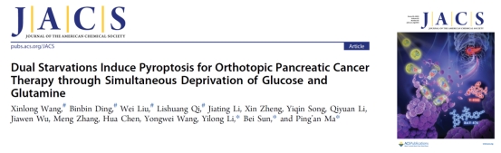 近日,beat365在线唯一官网附属第一医院孙备教授团队与中国科学院长春应用化学研究所马平安研究员团队合作开发了一种用于双重抑制葡萄糖和谷氨酰胺摄取诱导胰腺癌细胞焦亡的纳米药物,相关成果发表于《美国化学会志》(Journal of the American Chemical Society,影响因子:15)上,并入选为当期杂志封面文章之一。